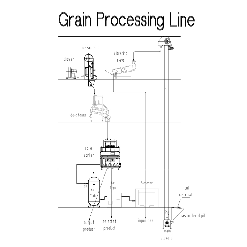 It includes multiple processing techniques such as lifting, cleaning, stone removal, and color sorting.