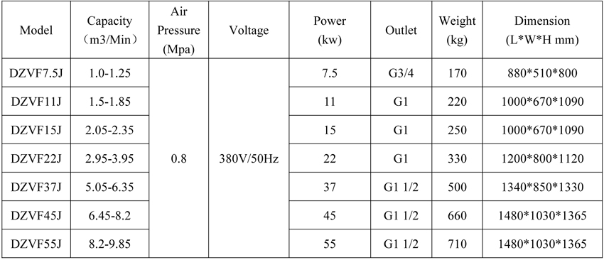 PARAMETERS OF OUR VARIABLE FREQUENCY SCREW COMPRESSOR: